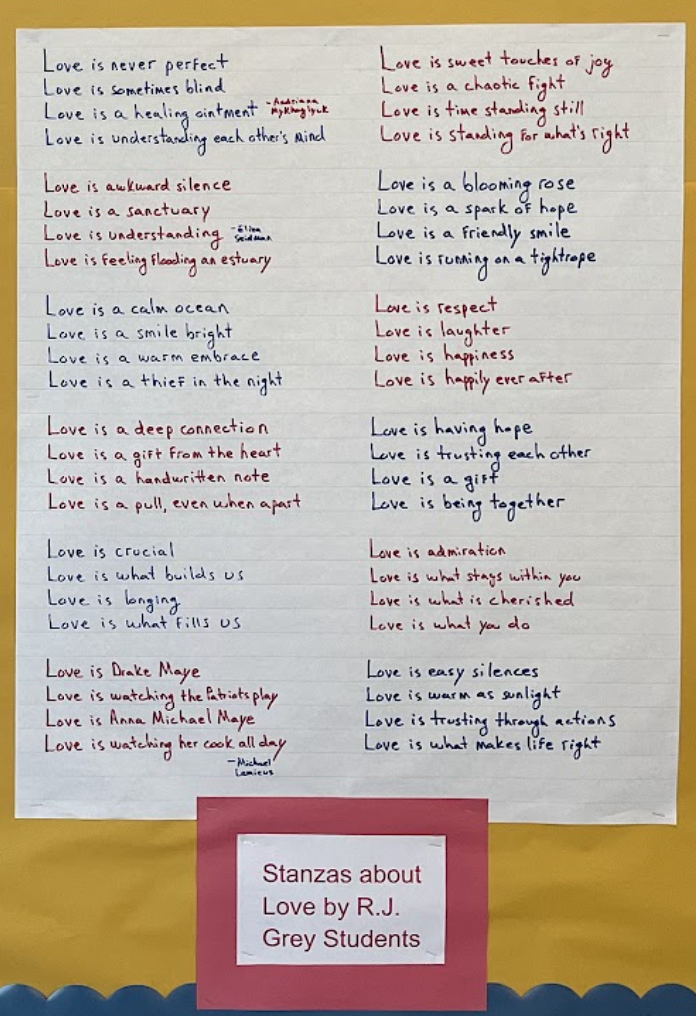 Separately, on display in our Cafe Annex are stanzas that students wrote about love. Mr. Malloy, our English teacher on 7 and 8 Green, asked students to write a brief stanza on what love means. This has been another nice addition to our hallways. Many students and staff have stopped by over the week to take a look at how our students define love.